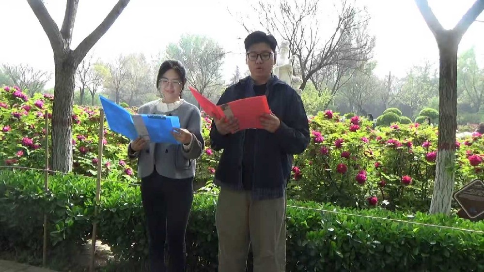 在这片牡丹盛放的土地上,诗人马华松挥笔写下《黄河颂》,开篇便气势如虹。记者在园内邀请两位从陕西宝鸡远道而来的青年,深情朗诵了这首诗的开篇:“天龙出雪域,奔流走东海;万里入胸怀,颂歌传千载。”