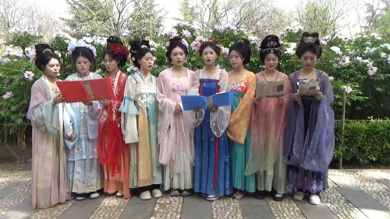 黄河,早已成为中华民族不屈精神的象征,更成为中华儿女心中砥柱中流的“图腾”。在牡丹园内,我们邂逅了九位宛如“仙女”般的姑娘,她们都来自三门峡工学院,记者特意邀请她们,深情朗诵了这句承载着民族情怀的话语,让黄河的磅礴情怀与园内盛放的牡丹相映成趣——牡丹的雍容傲骨,恰如黄河滋养下中华民族的不屈姿态,二者共生共辉,定格下这片土地的家国情怀。