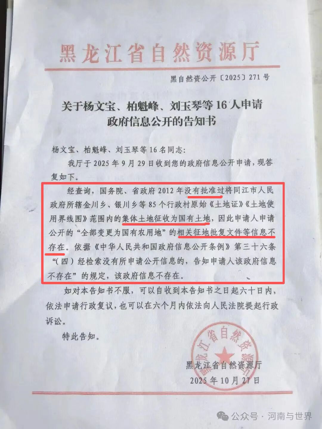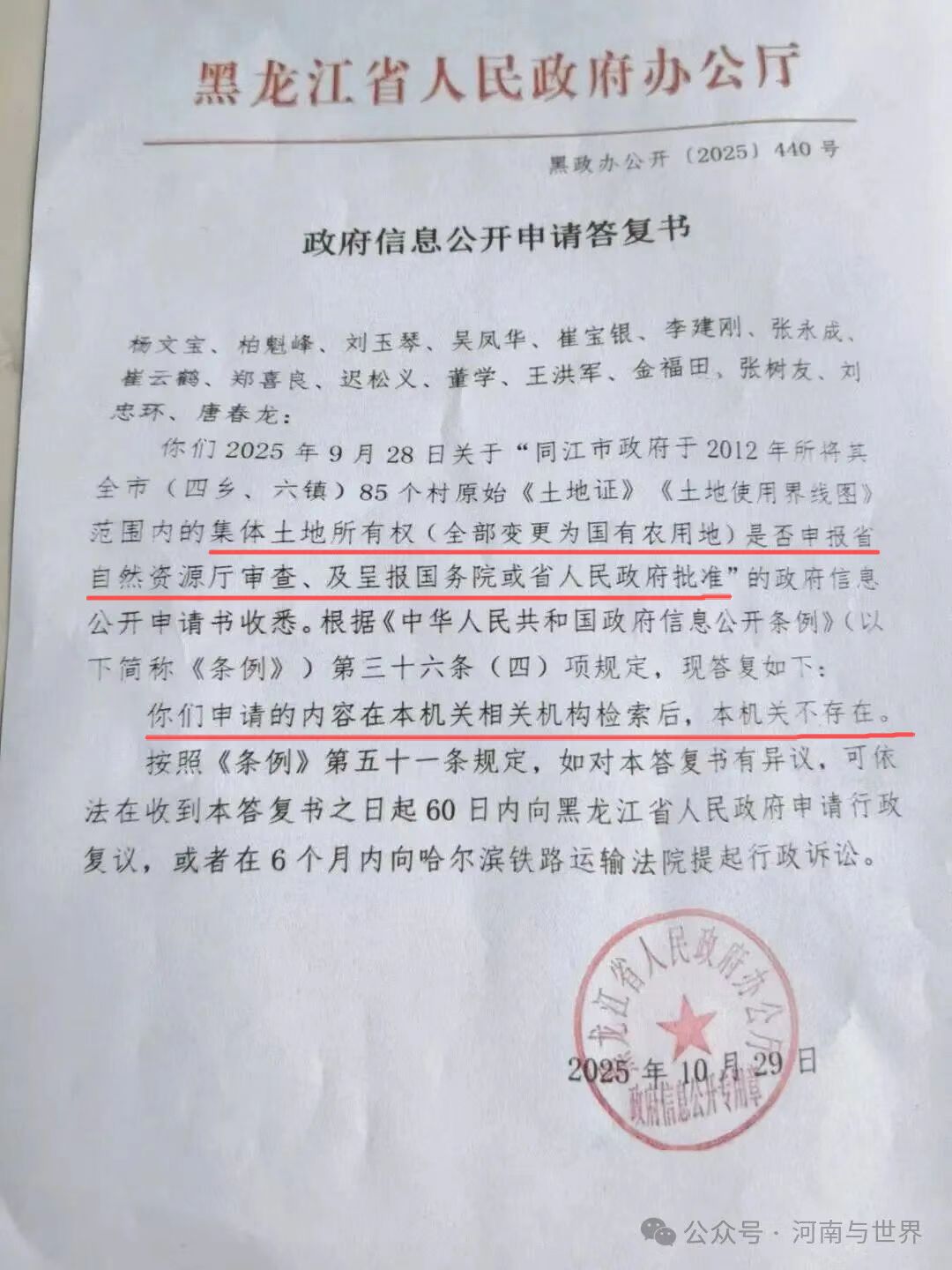 ” 刘玉琴说的文件,是1996年同江市人民政府出台的一份同政发〔1996〕9号文件《关于进一步明确我市土地资源权属的决定》。 “文件宣布原《土地证》无效,这样就把集体土地变成了国有土地。”刘玉琴说,2012年,“市里突然宣布,我们种地要交地租了。” “一开始是一亩地60元租金,交了3年,后来涨到了90元一亩,交了4年,之后160元一亩,就是不断在涨。我们这地方地多,一家都承包了好几垧地,多的甚至十几垧,一垧地是15亩,要缴纳2400元。”同江市金川乡金华村村民代表杨文宝说。 同江市相关部门均称“没制作、保存或获取”土地变更文件 村里的集体土地怎么轻易就变成国有土地了呢?东五乡85个行政村的村民申请政府公开变更依据等相关文件,但是,同江市人民政府和同江市自然资源局的答复却让他们很迷茫。 同江市人民政府办公室回复,申请公开的上述信息非同江市人民政府或同江市人民政府办公室制作、保存或获取。建议向同江市自然资源局进行申请或咨询。 同江市自然资源局答复,申请公开的信息非同江市自然资源局制作、保存或获取。 “这就奇怪了,政府和主管部门都没有制作、保存或获取,那这些决定、这些行政行为是怎么做出来的?天上掉下来的吗?”杨文宝说。 黑龙江省自然资源厅回复“没有批准将集体土地征收为国有土地。” 为了弄清事情真相,村民们又向黑龙江省政府和省自然资源厅申请政府信息公开。 2025年10月27日黑龙江省自然资源厅回复,经查询,国务院、省政府2012年没有批准过将同江市人民政府所辖金川乡、银川乡等85个行政村原始《土地证》《土地使用界线图》范围内的集体土地征收为国有土地。