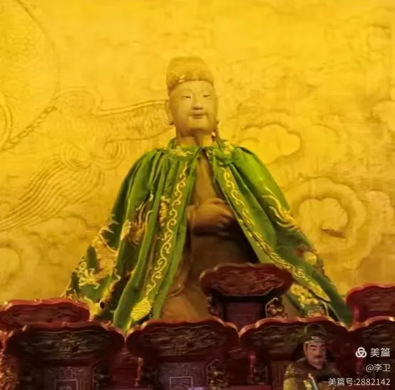 谭杰会长将我们带进三家店村龙王庙。龙王庙创建于明代,坐东朝西,是三合院形式,上镶有石额“古刹龙王庙”。殿内龛台上端坐着北京地区仅存的五尊乾隆时期的龙王神像,两旁有雷公、电母等塑像。让我大开眼界的是,龙王庙内供奉着北京现存唯一的永定河神像。第一次看到永定河神像,我不禁仔细端详:永定河神像端坐于描金漆座,面容温润,眉宇间透着慈祥与庄严。只见头戴九梁巾,冠顶宝珠微垂,衣袂以明黄为底,外罩翡翠绿缎袍,袍身绣金鳞腾跃、祥云缭绕。双手交叠于腹前,掌心隐合阴阳太极之势,虽静默不语,却似含镇水安澜之威。