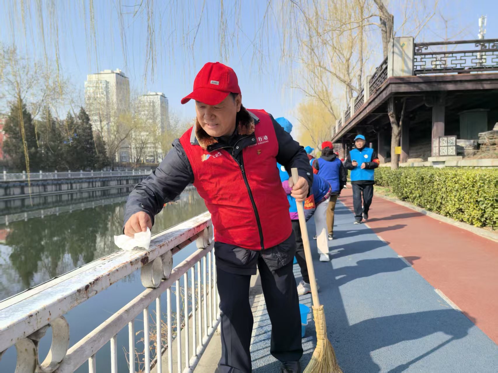 培训结束后,河湖保护志愿者们身体力行,拿起扫帚、簸箕、抹布、水桶等工具,对通惠河岸的绿植、道路进行打扫,对护城河护栏、设施进行了认真擦拭,并对周边环境垃圾进行了清理。