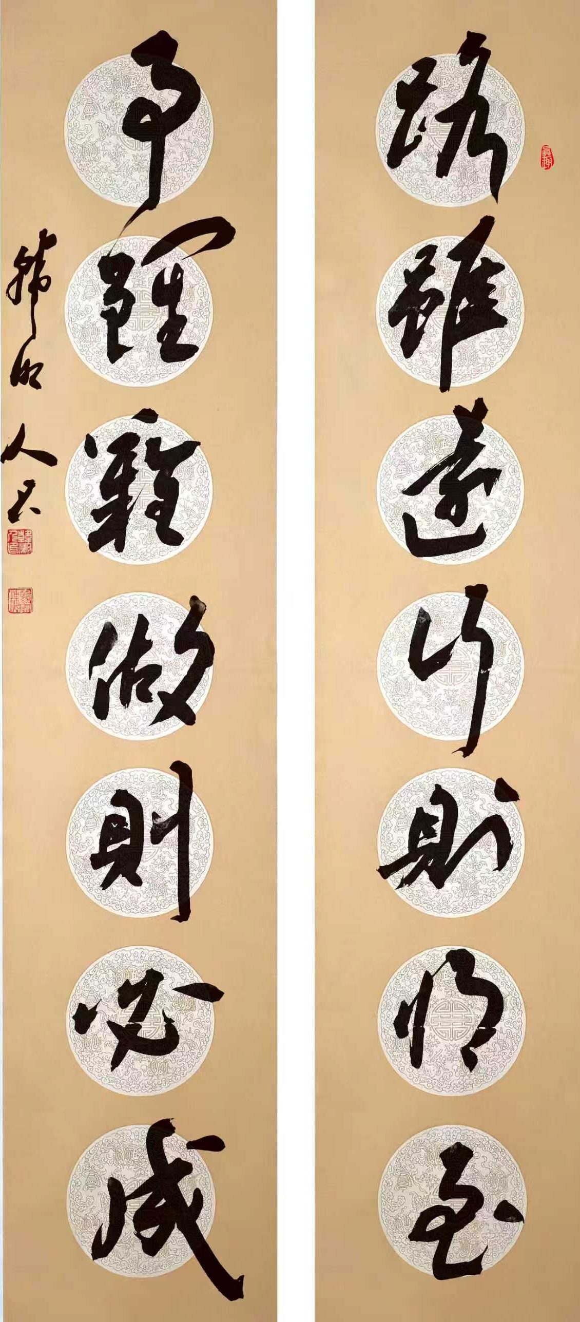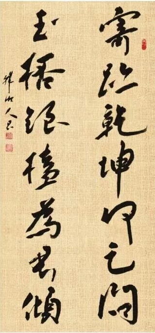 在笔法与线条上,韩湘人在保留王宠中锋圆转、温润含蓄特质的基础上,融入了更丰富的笔墨变化与力量感。王宠书法以小字见长,线条纤秀空灵,而韩湘人将其精微笔法放大,无论是小字行草,还是榜书楹联,皆笔力雄健,线条苍浑厚重,既保留王宠的雅逸,又增添了当代书法的气势与张力。他打破王宠书法 “娟秀内敛” 的固有格局,在线条中融入轻重、缓急、枯润的微妙对比,使原本简约的点画具备了更强的节奏感与表现力。针对当代展厅视觉审美,他适度强化了提按顿挫的幅度,让线条在温润中不失筋骨,在含蓄中暗藏锋芒,实现了 “以大显小,以厚显雅”的视觉突破,让王宠书风既有晋人的清韵,又有当代的厚重。