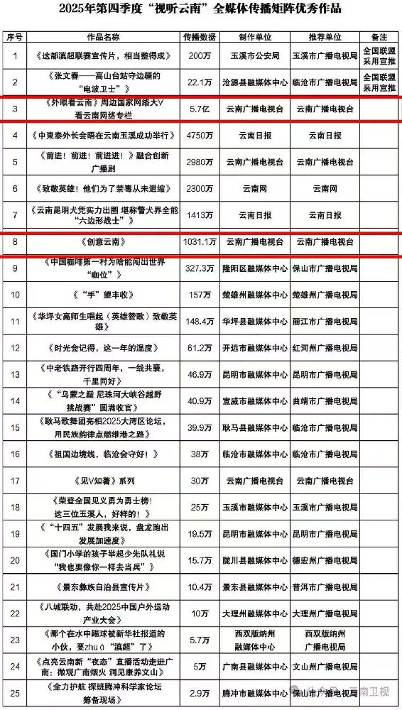 凤凰新闻网络电视台(记者司孟奇)近日,在云南省广电局2025年第四季度“视听云南”全媒体传播矩阵作品推优工作中,云南广播电视台对外传播中心打造的《外眼看云南-周边国家网络大V看云南网络专栏》与《创意云南》两档精品节目,从全省各单位推荐的109件作品中脱颖而出,成功入选25件季度优秀作品。这一成果,是云南广播电视台对外传播中心坚守主流价值、深耕创新表达的生动实践,更是其以融媒实干诠释媒体担当,为中国式现代化云南篇章注入主流媒体力量的有力彰显。