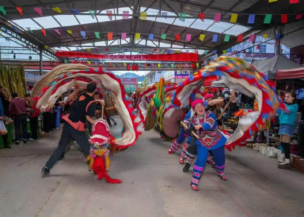 展演队伍沿着古镇广场、花腰中街、花腰上街徐徐前行,穿过威严的嶍峨城门,走进熙攘的西门农贸市场,最终抵达滇中第一烧烤城。整条巡游路线宛如一条流动的文化长河,将非遗的魅力源源不断地传递给沿途观众。人们或驻足凝望,沉醉于精彩瞬间;或跟随队伍前行,不知不觉融入这场文化狂欢之中。在感受非遗独特魅力的同时,浓浓的年味也在欢声笑语中愈发浓郁。