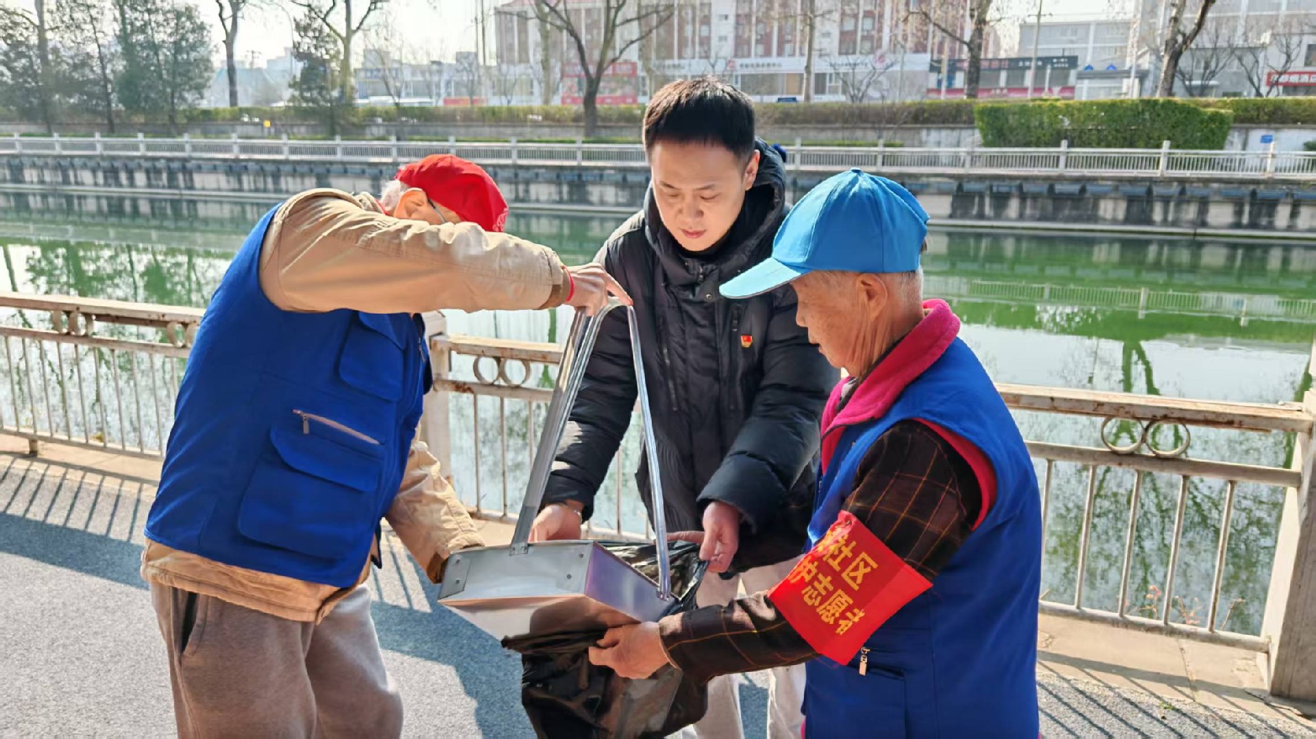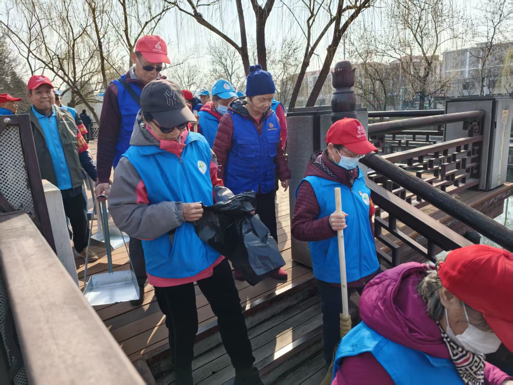 培训结束后,河湖保护志愿者们身体力行,拿起扫帚、簸箕、抹布、水桶等工具,对通惠河岸的绿植、道路进行打扫,对护城河护栏、设施进行了认真擦拭,并对周边环境垃圾进行了清理。