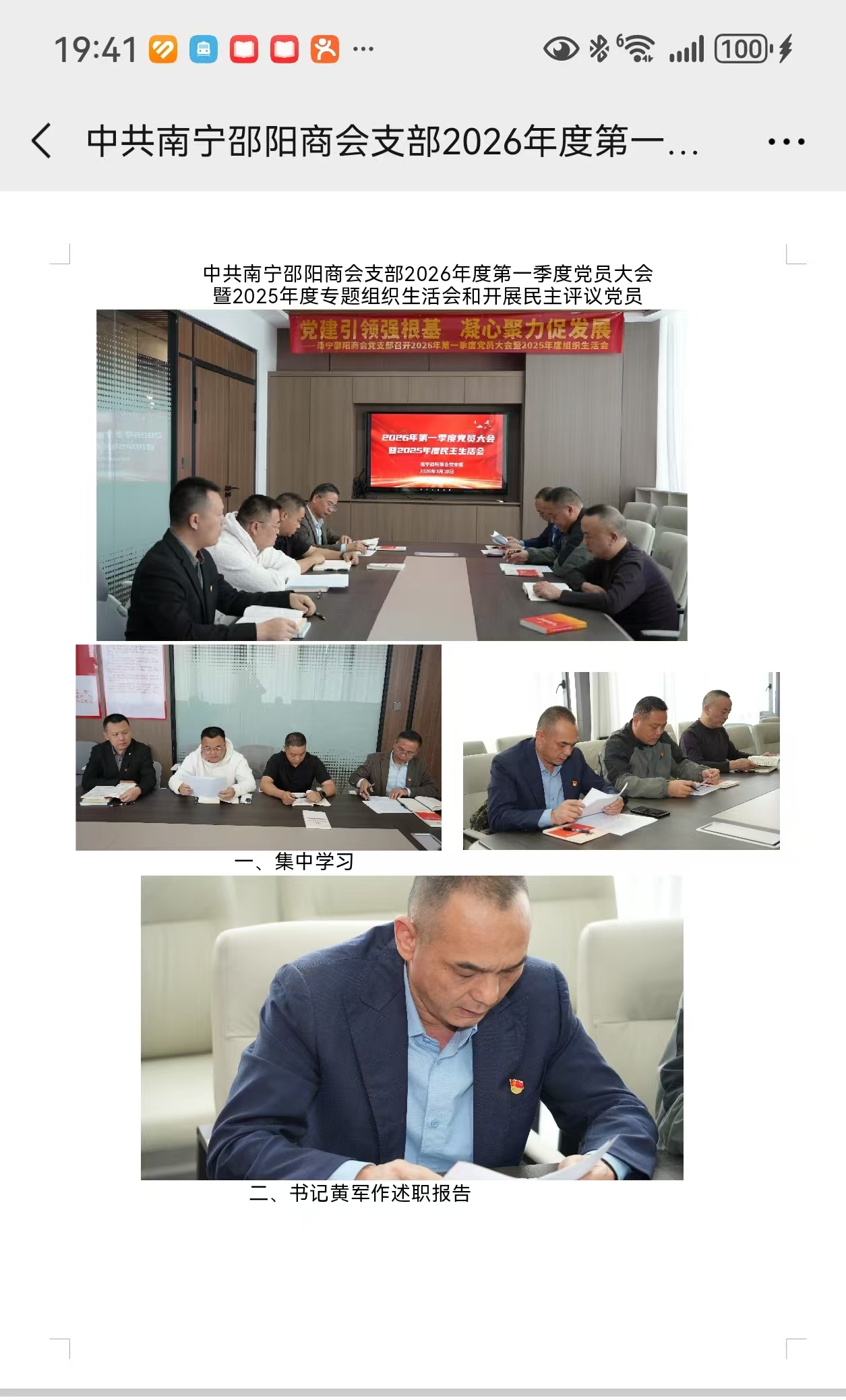 凤凰新闻网络电视台讯:记者:钟 勋报道:为深入学习贯彻党的二十大及二十届三中、四中全会精神,严格落实基层党组织组织生活会和民主评议党员工作要求,与时俱进地加强党的领导,提高对党的认识,坚决贯彻执行党的路线、方针和政策,认真履行新时期党员义务,按照党的原则与标准严格要求自己,以党建引领商会高质量发展。日前,由党支部书记黄军同志主持,全体党员参加,广西南宁邵阳商会党支部召开2026年第一季度党员大会暨2025-2026年度组织生活会、民主评议党员大会。