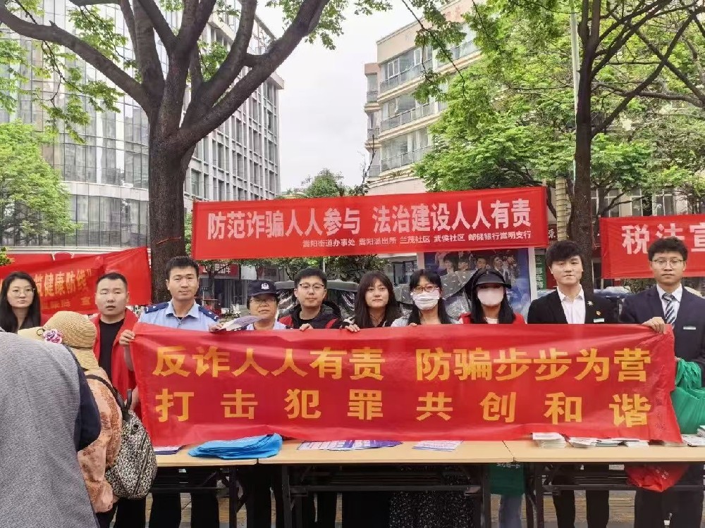 凤凰新闻网络电视台记者(潘友菊)2026年4月19日 ,为进一步提升居民防范电信网络诈骗的意识和能力,守护群众财产安全,切实筑牢基层反诈防护网,近日,嵩阳街道办事处联合嵩阳派出所、邮储银行嵩明支行、武侯社区和兰茂社区在海宇花园小广场开展“防范诈骗人人参与、法治建设人人有责”的主题宣传活动,将反诈知识送到群众身边。